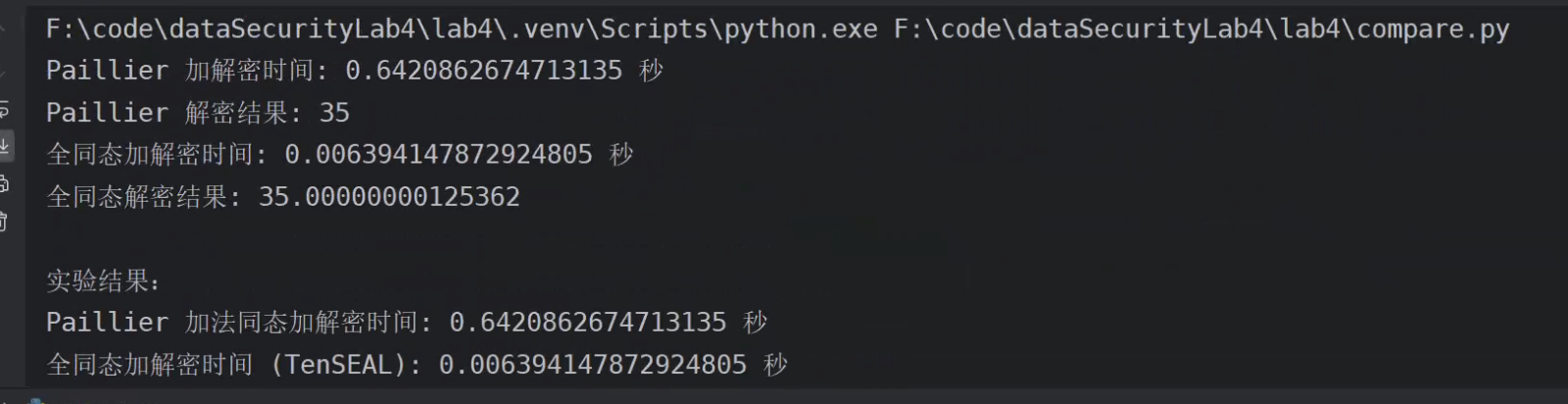- 在不计入密钥生成时间的情况下,Paillier 加解密的时间显著小于全同态加密(TenSEAL)的加解密时间。